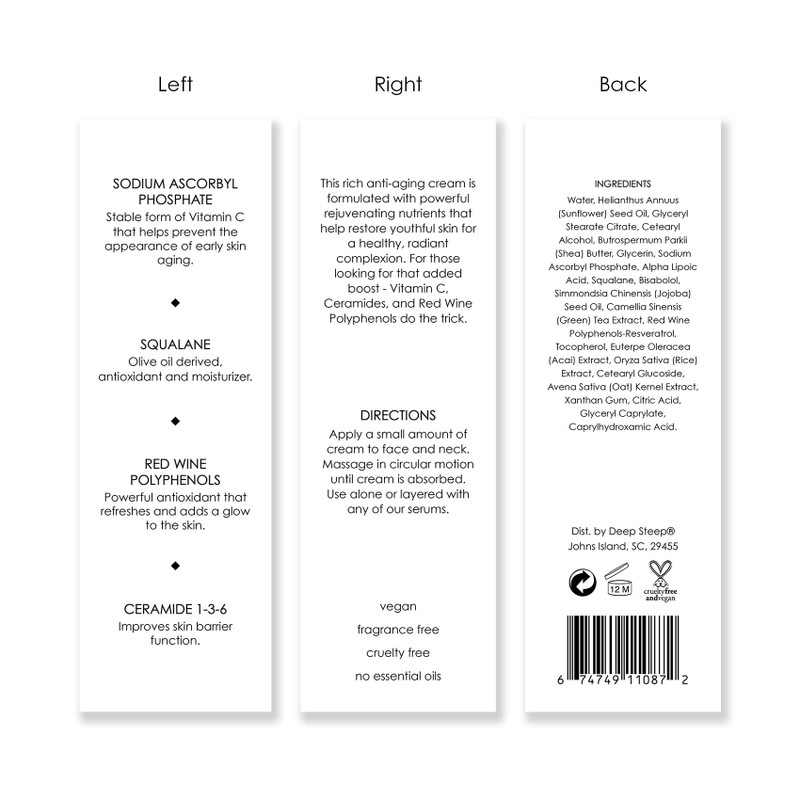 Directions: Apply a small amount of cream to face and neck skin. Massage in circular motions until cream is absorbed. Use in morning alone or layered with our serums.