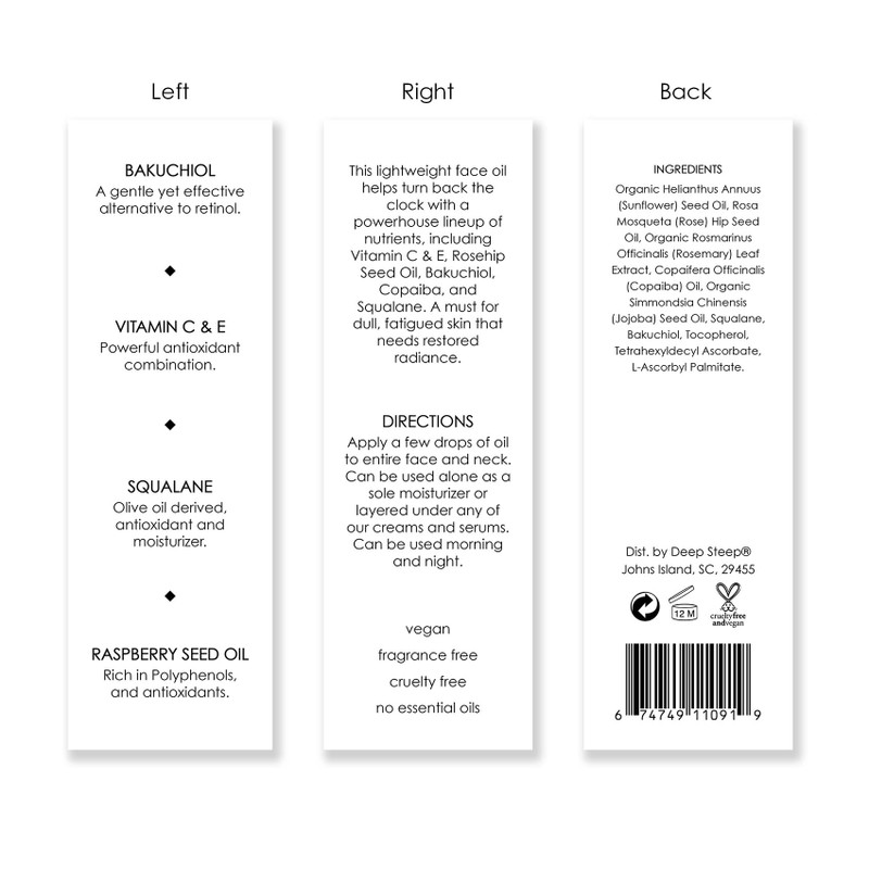 Directions: Apply a few drops of oil to entire face and neck. Provides excellent coverage. Can be used alone as a sole moisturizer or layered under other creams and serums. Can be used morning and night.