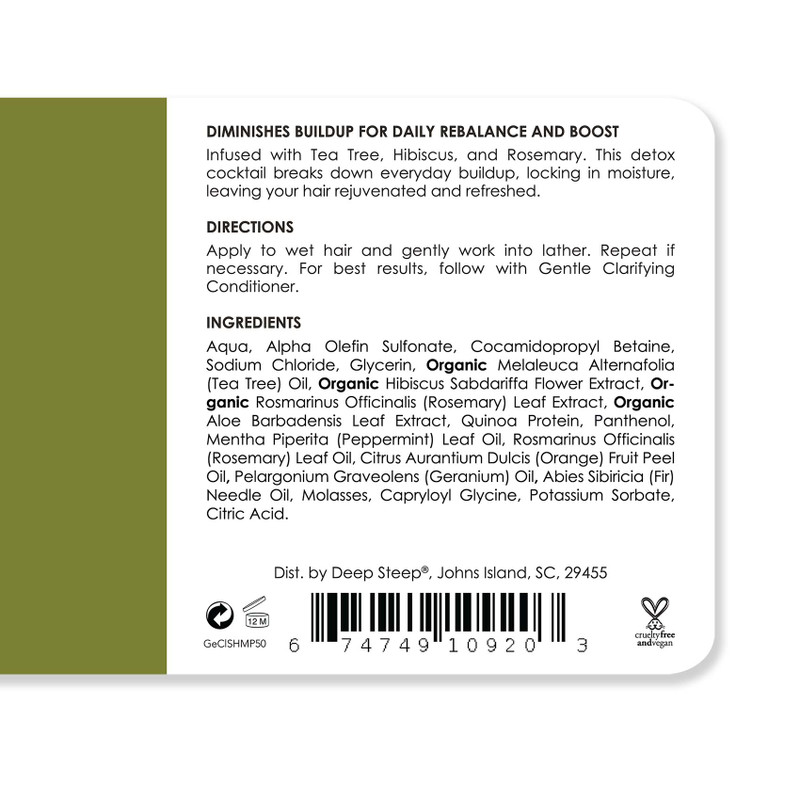 Infused with Tea Tree, Hibiscus, and Rosemary. This detox cocktail breaks down everyday buildup, locking in moisture, leaving your hair rejuvenated and refreshed.