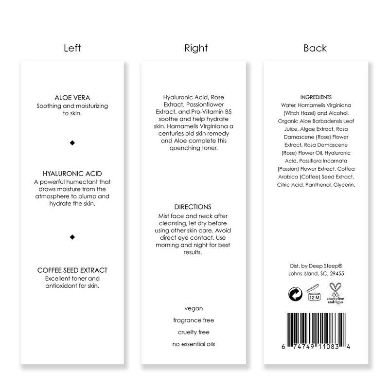 Directions: Mist face and neck after cleansing, let dry before using other skin care. Avoid direct eye contact. Use morning and night.