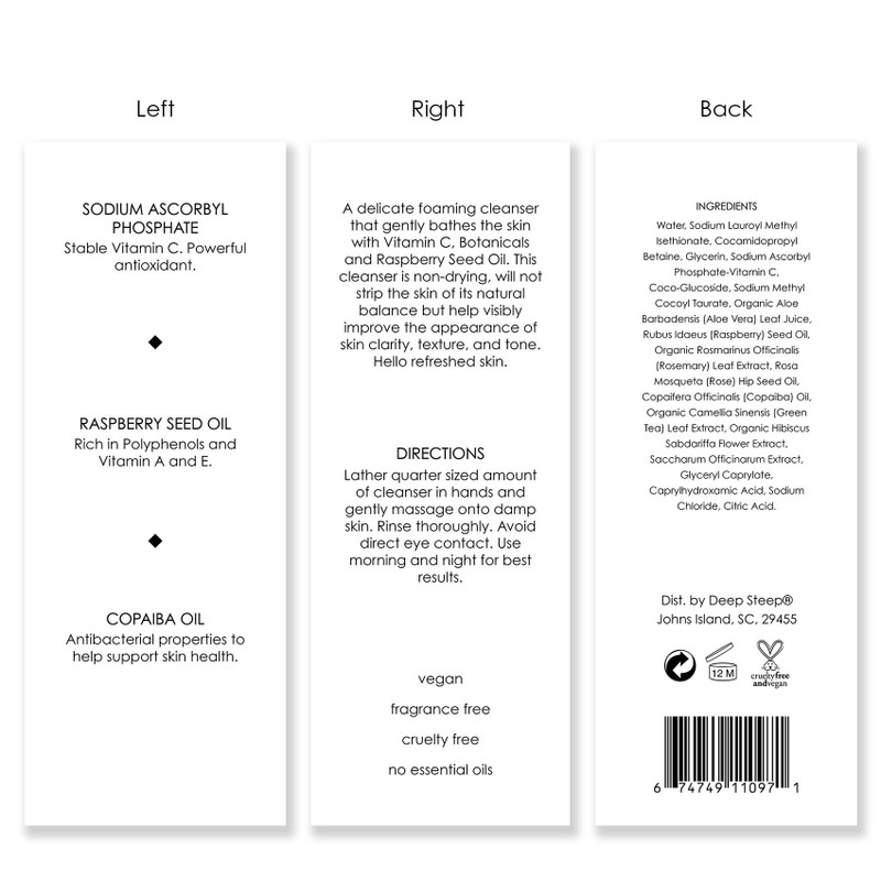 What it is: A delicate foaming cleanser that gently bathes the skin with Vitamin C, Botanicals and Raspberry Seed Oil. This cleanser is a non-drying, will not strip the skin of its natural balance but help visibly improve the appearance of skin clarity, texture, and tone.