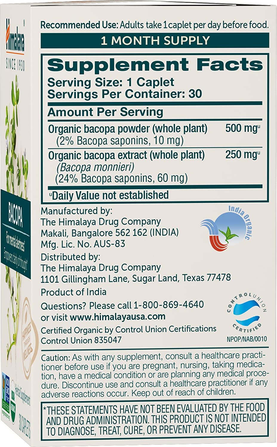 Each Himalaya Organic Bacopa caplet is equivalent to 3,300 mg of Organic Bacopa powder per serving.